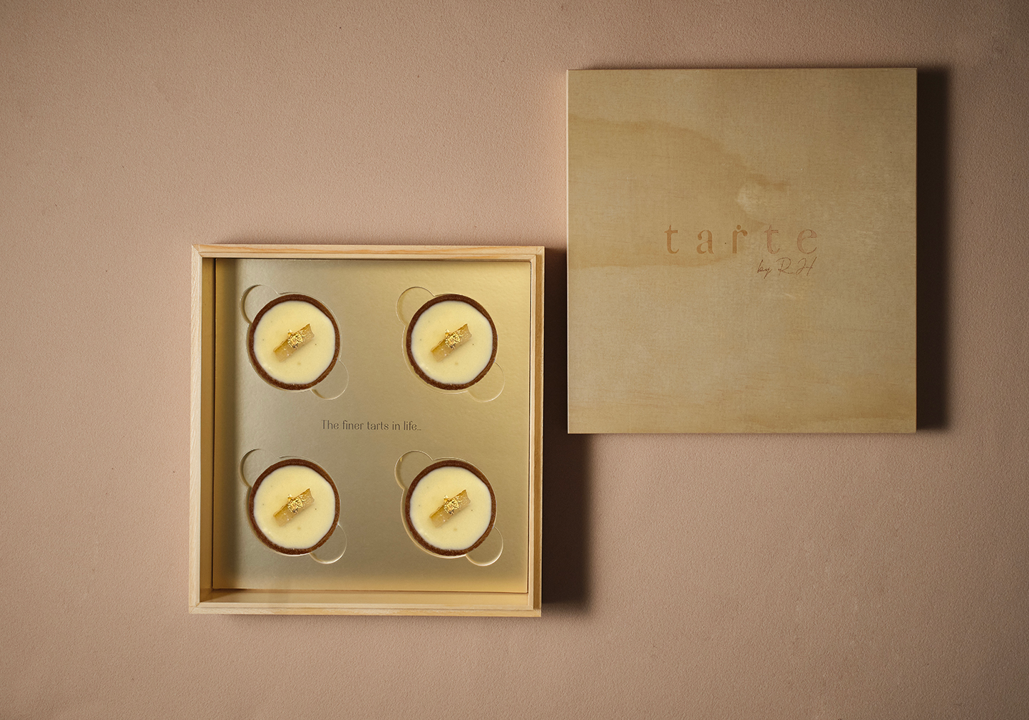 Our signature shortcrust tart is filled with a vibrant, freshly squeezed lemon curd that’s both tangy and delicately sweet — a timeless classic, elevated with candied lemon and a shimmer of 24K gold flakes.