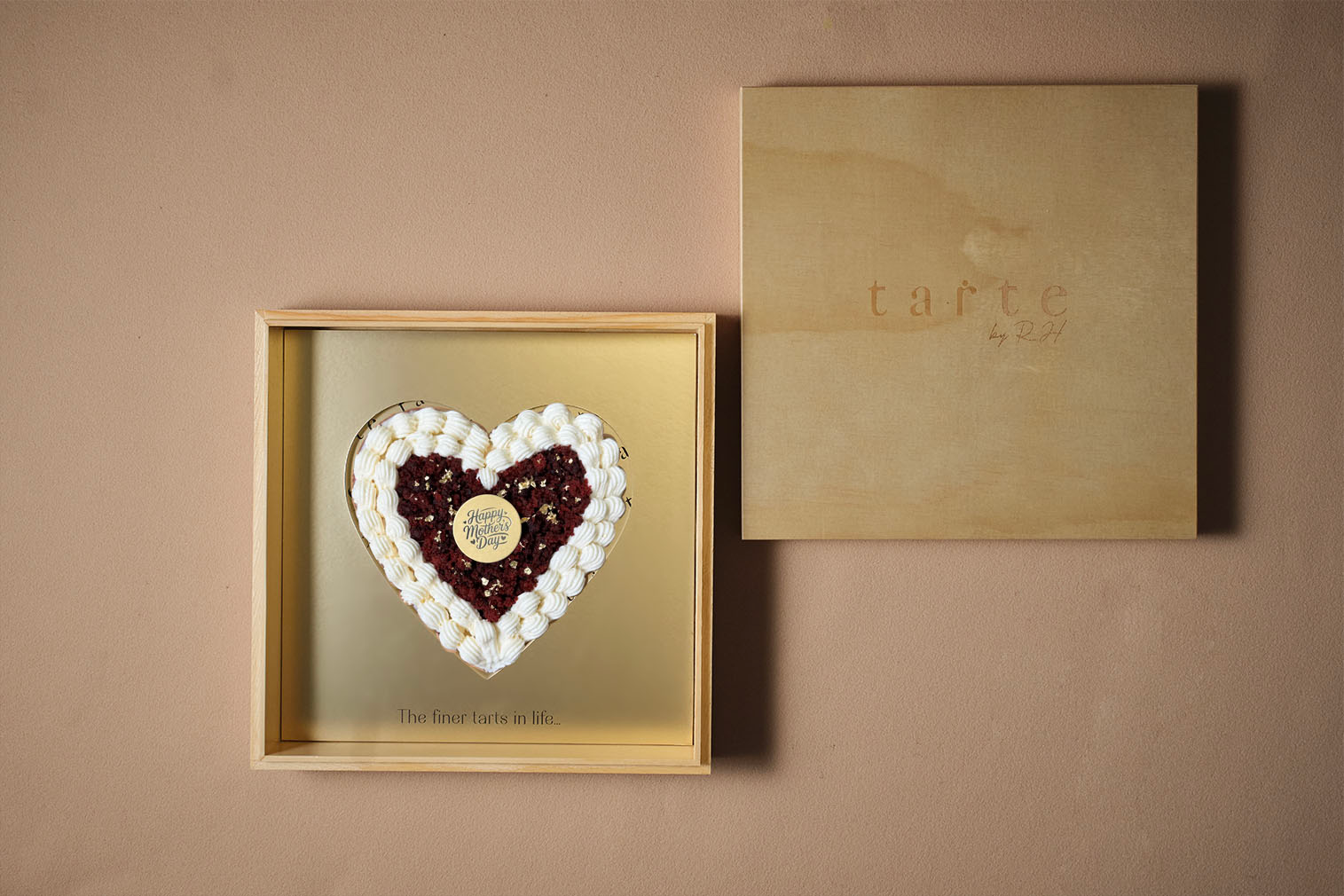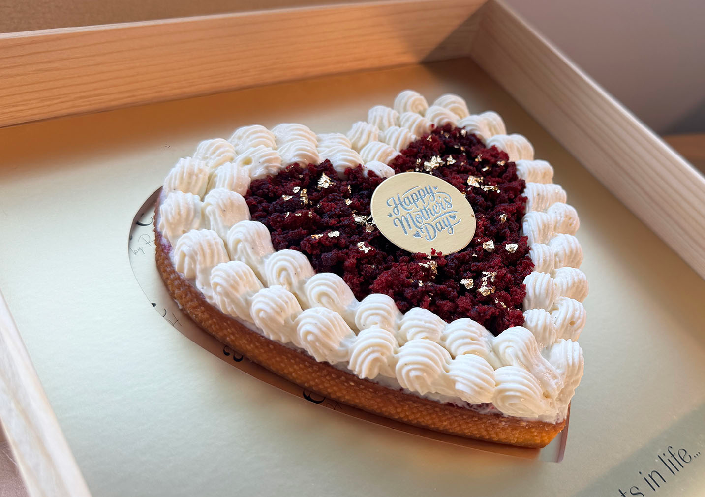 Delight in the luxurious harmony of rich red velvet cake, velvety cream cheese mousse, topped with red velvet crumble filled in a buttery sweet short crust tart, creating a perfectly balanced experience of deep cocoa notes and subtle tanginess. Elegantly adorned with delicate edible flowers, a Happy Mother’s Day sign, and shimmering 24K gold flakes.